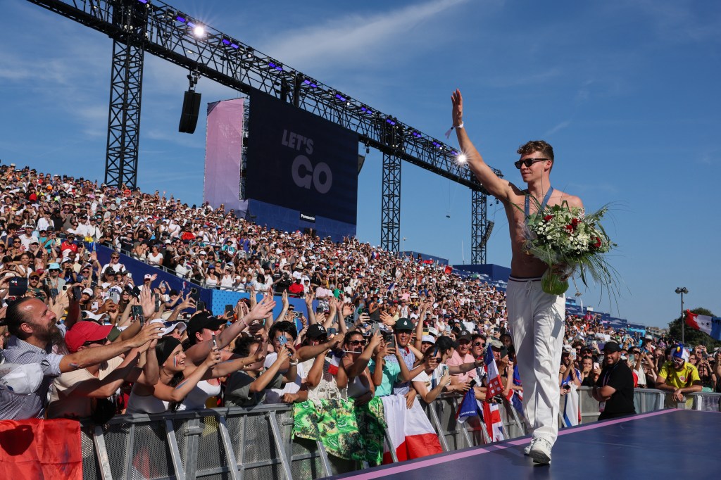 Outro dia, quem apareceu foi uma das estrelas dos Jogos, León Marchand, o nadador que ganhou quatro ouros e um bronze na piscina de La Défense. O povo foi à loucura, recebendo o campeão aos gritos de “Lé-on, Lé-on!”, que se deixou fotografar e ainda assinou camisetas. Tudo de graça, inflação zero.