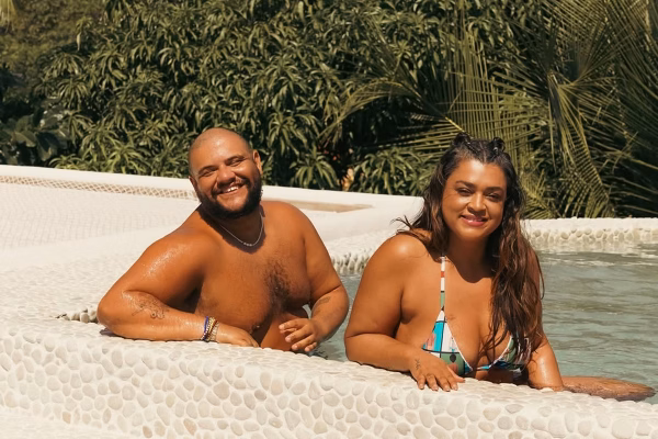 Preta Gil e Gominho posam juntos e sorridentes na piscina